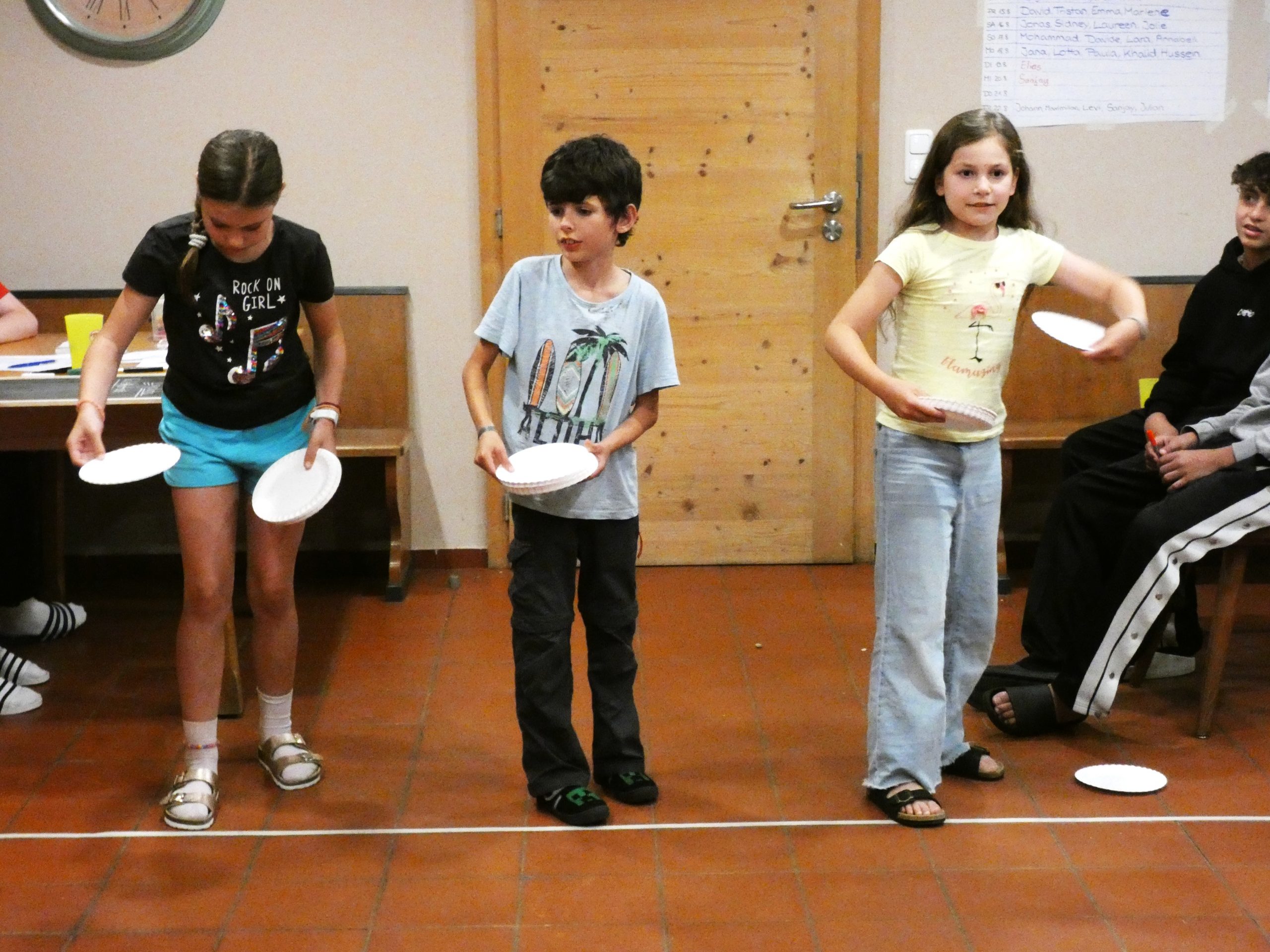 2-4 Kinder spielen jeweils gegeneinander. Jeder kommt mal dran. Zunächst tippt jeder auf einem ‚Lottozettel‘, worauf nur die Spieler, aber nicht die Spiele stehen, wer das jeweilige Spiel gewinnt.